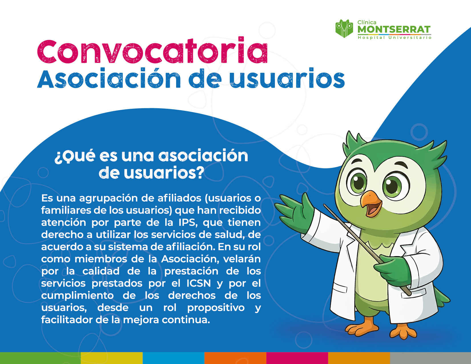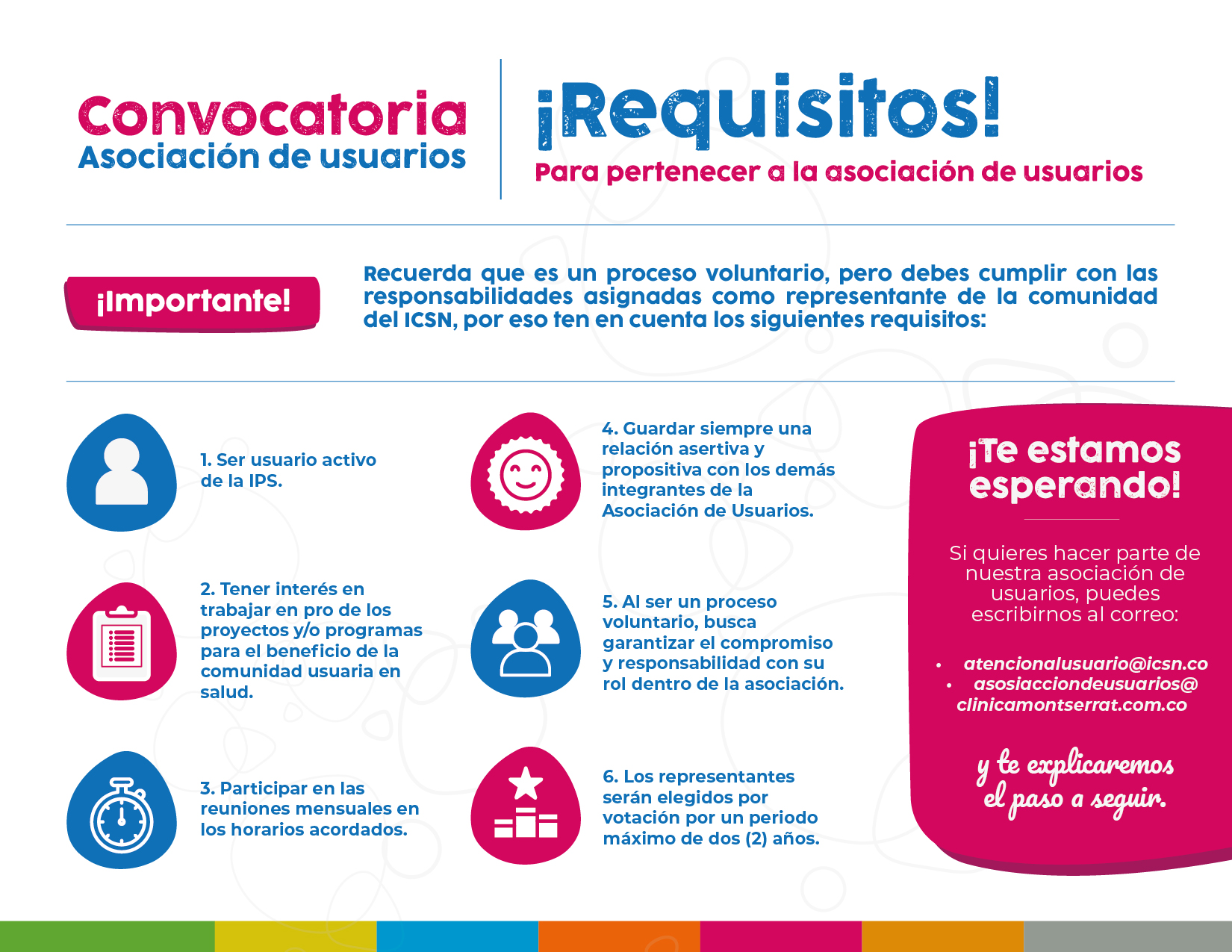 El ICSN Clínica Montserrat, en cumplimiento a lo dispuesto en la normativa legal vigente, se permite invitarlos a la elección de la Junta directiva de la ASOCIACIÓN DE USUARIOS.